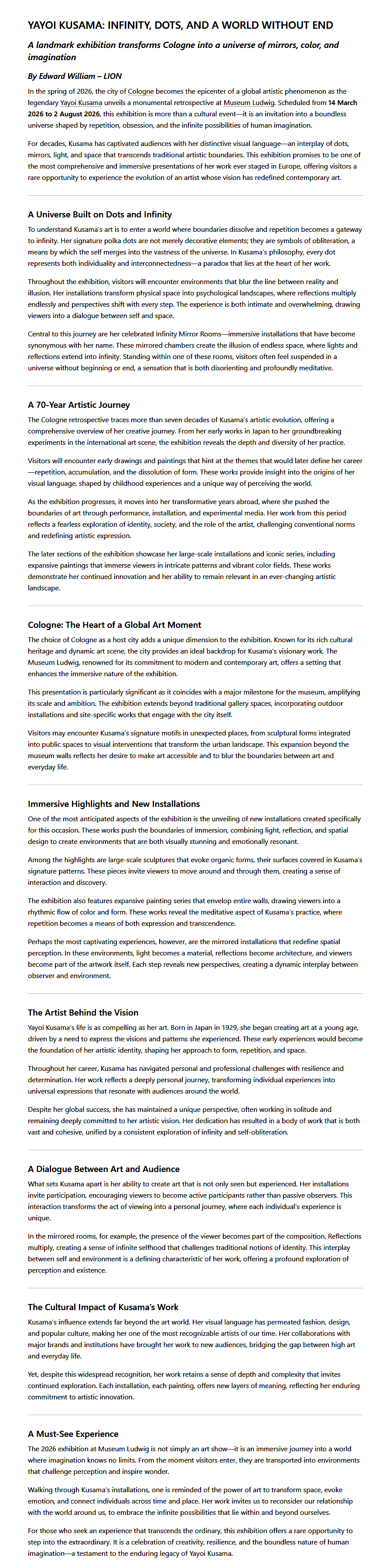 In 2026, the vibrant, hypnotic world of Yayoi Kusama arrives in spectacular form at Museum Ludwig, turning the German city into a global hub of contemporary art. Running from 14 March 2026 to 2 August 2026, this major retrospective is not just another exhibition