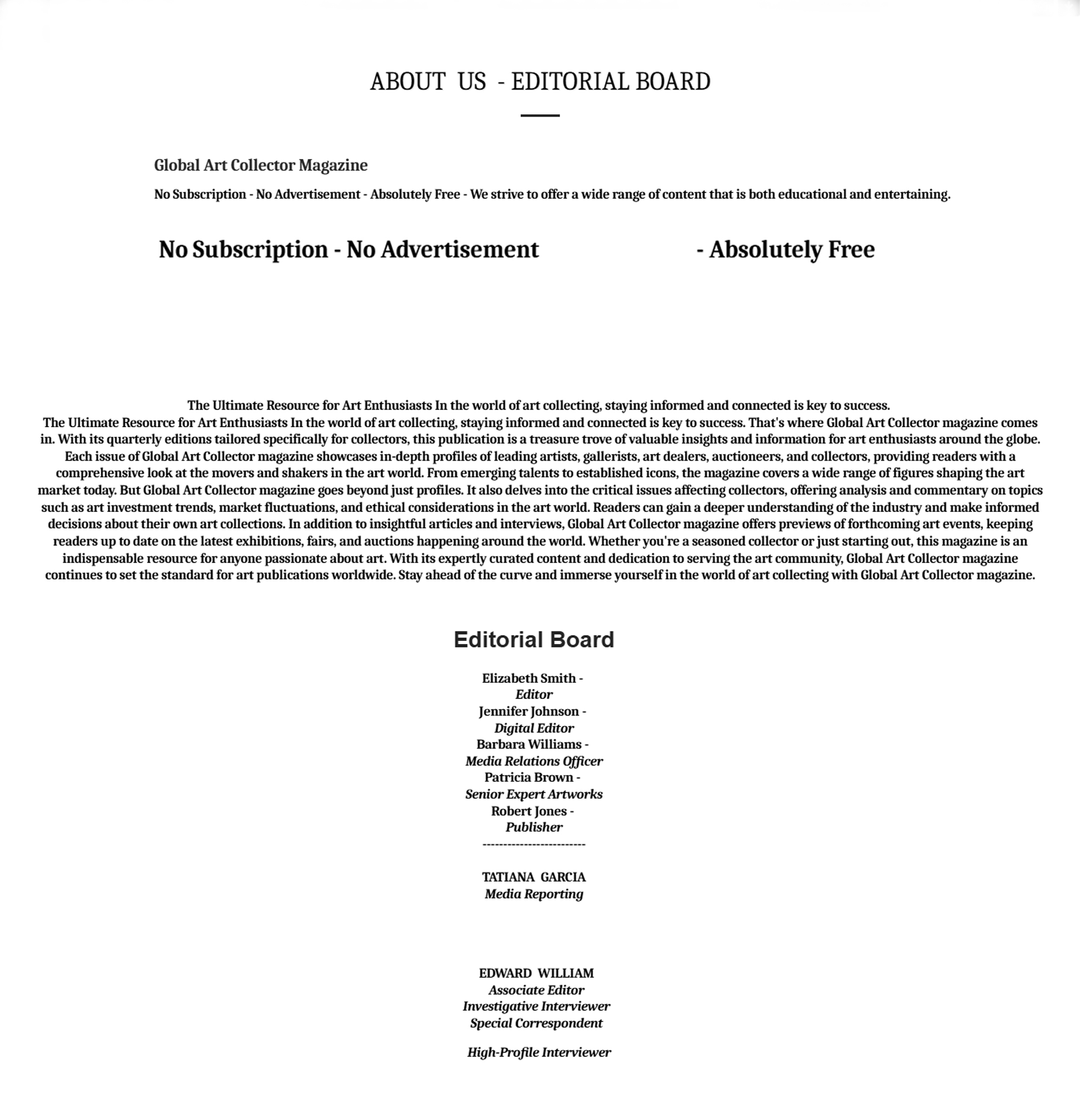 Global Art Collector.net is not responsible for any consequences that may arise from the use of the information published on this website. We reserve the right to modify or delete any content at any time without notice, and we do not warrant that the website will always be available or free from errors, interruptions, or delays.