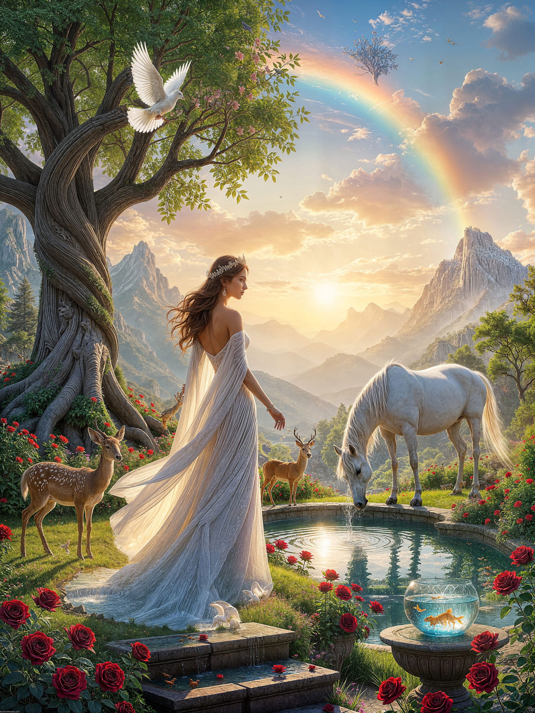 to illustrate peace as it should be, not as it was lost. In this allegorical painting, life blossoms not metaphorically, but visually, sensorially, undeniably. A woman, robed in cascading white, stands as the sovereign emblem of human dignity. Her presence is not political; it is universal. She represents humanity every gender, nation, and identity framed not as victim, but as inheritor of life.